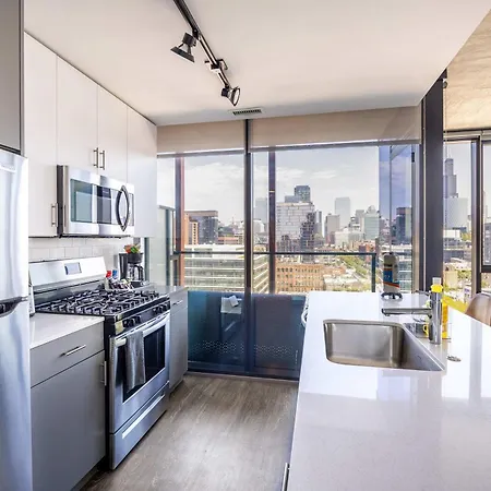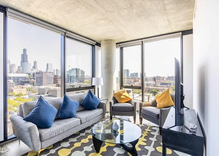 The 130 ft² Bright & Modern 2Br Perfect City Escape Chicago apartment is located 1.2 miles from the super - tall skyscraper "Willis Tower" and only a 6-minute walk from Randolph Street Market.