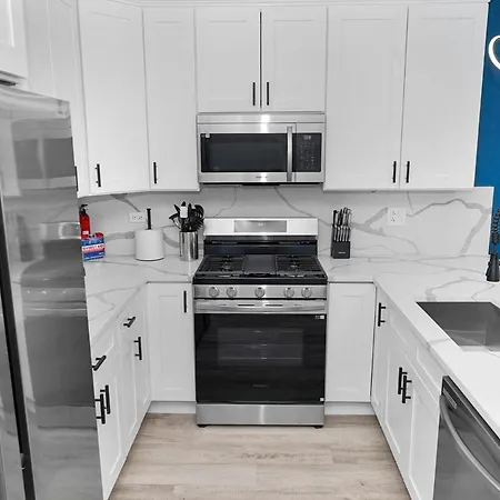An equipped kitchen at Stylish Cozy 3Br Retreat With Free Parking Near Pilsen Art Center, Douglas Park And University Of Illinois Chicago apartment includes oven and a dishwasher. Stylish Cozy 3Br Retreat With Free Parking Near Pilsen Art Center, Douglas Park And University Of Illinois Chicago apartment is right around the corner from Washtenaw & 15th Street bus stop.